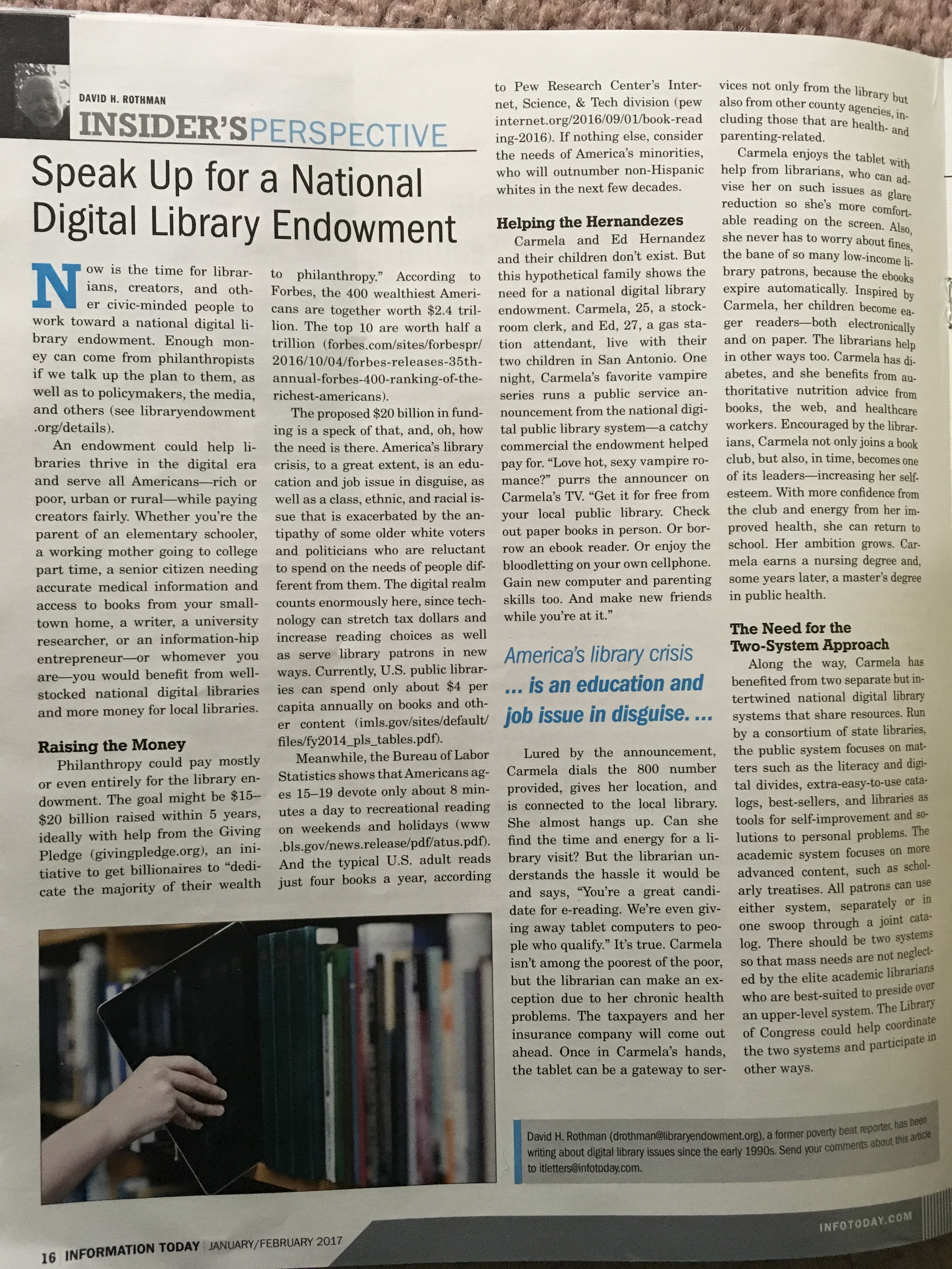 But you can also drill down for details here and elsewhere. See articles in the Washington Post, Publishers Weekly, the Philadelphia Inquirer, the Christian Science Monitor, Education Week, Library Journal, and the Chronicle of Philanthropy (image). Also see our Inquirer article on the need for two national digital library systems, which the endowment could help finance.